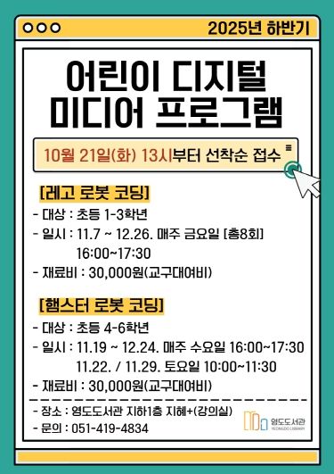 [경남도민뉴스=김채연 기자] 영도도서관에서 어린이복합문화공간의 디지털 교육환경을 기반으로 관내 어린이들의 디지털 역량 강화와 창의력 향상을 위한 ‘2025년 하반기 어린이 디지털 미디어 프로그램’을 운영한다.