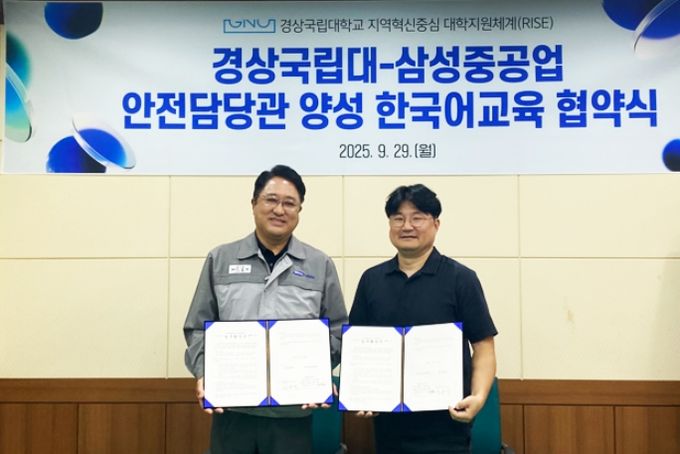 [경남도민뉴스=구인애 기자] 경상국립대학교 RISE사업단 산학친화프로그램과 삼성중공업은 9월 29일 오후 가좌캠퍼스 언어교육실 국제교육부처장실에서 외국인 근로자의 안전한 근로환경 조성과 지역사회 정주 여건 조성을 위해 ‘외국인 근로자 대상 한국어 교육체계 구축에 관한 업무협약’을 체결했다.