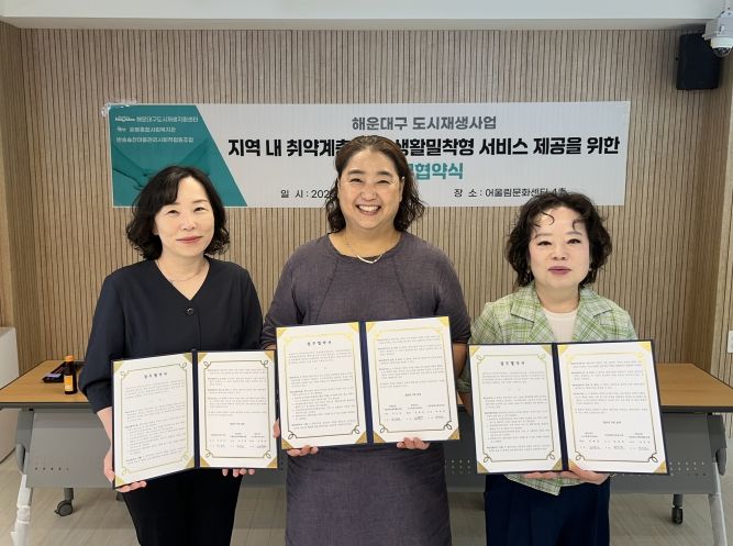 [경남도민뉴스=김채연 기자] 해운대구도시재생지원센터(센터장 정혜경)는 9월 30일 운봉종합사회복지관(관장 박일영), 반송솔찬마을관리사회적협동조합(이사장 강선희)과 도시재생사업 지역 내 취약계층을 대상으로 한 생활밀착형 서비스 제공을 위한 업무협약을 체결했다.