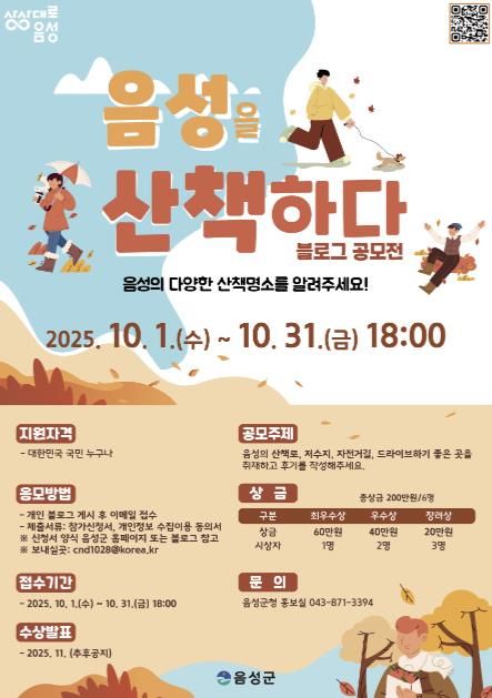 [경남도민뉴스=박만수 기자] 음성군이 지역 곳곳의 아름다운 산책 명소의 매력을 알리기 위해 지난 1일부터 이달 31일까지 ‘2025년 음성군 블로그 공모전’을 개최한다.