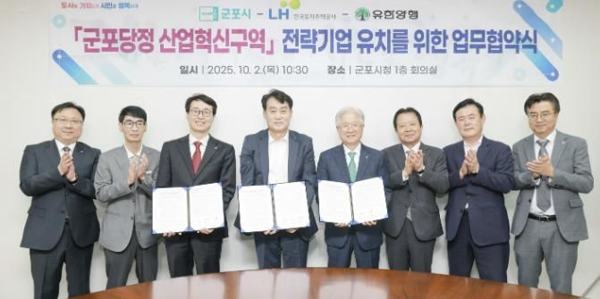 [경남도민뉴스=김동규 기자] 군포시는 2일 군포시청에서 한국토지주택공사(LH), ㈜유한양행과 ‘군포당정 산업혁신구역’ R·D 전략기업 유치를 위한 업무협약을 체결했다고 밝혔다.