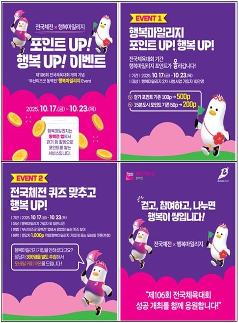 [경남도민뉴스=신석주 기자] 부산시는 제106회 전국체육대회 개최를 기념하여 부산이즈굿 동백전 '행복마일리지' 특별 이벤트인 '포인트 업(UP)! 행복 업(UP)!'을 오는 10월 17일부터 23일까지 7일간 추진한다고 밝혔다.