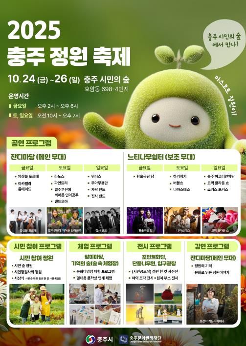 [경남도민뉴스=박만수 기자] 충주시와 (재)충주문화관광재단은 10월 24일부터 26일까지 3일간 충주 시민의 숲(호암동 698-4번지)에서 ‘2025 충주 정원 축제’를 개최한다고 밝혔다.