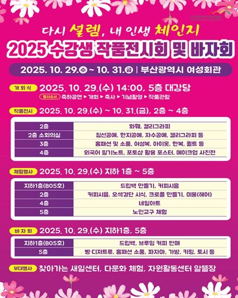 [경남도민뉴스=신석주 기자] 부산시 여성회관은 수강생들의 배움의 성취와 경제활동 의욕 고취를 위한 '2025년 수강생 작품전시회 및 바자회'를 오는 10월 29일부터 31일까지 '다시 설렘, 내 인생 체인지'라는 주제로 개최한다고 밝혔다.