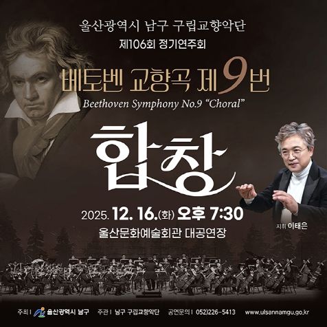 [경남도민뉴스=최재경 기자] 울산 남구 구립교향악단(지휘자 이태은)은 16일 오후 7시 30분, 울산문화예술회관 대공연장에서 ‘2025 송년음악회’를 열고 한 해를 마무리하는 품격 높은 클래식 무대를 선보인다.