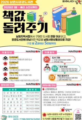 [경남도민뉴스=최인태 기자] 남원시는 시민들의 독서 참여를 확대하고 지역서점과의 상생을 도모하기 위해 '2026년 책값 돌려주기 사업'의 지원 규모를 확대해 운영한다고 밝혔다.