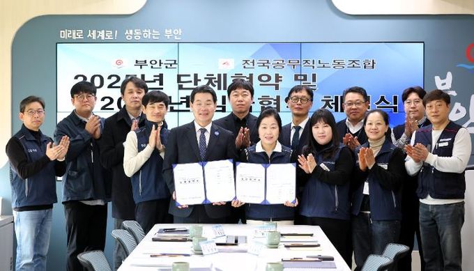 [경남도민뉴스=최인태 기자] 부안군과 전국공무직노동조합 부안군지부는 지난 10일 권익현 부안군수와 이말순 부안지부장 등 노사 양측 교섭위원 12명이 참석한 가운데 2025년 단체 및 2026년 임금협약을 체결했다고 밝혔다.