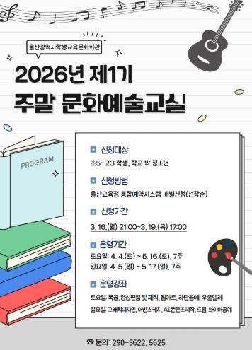 [경남도민뉴스=최재경 기자] 울산학생교육문화회관은 오는 4월 4일부터 5월 17일까지 울산 지역 초등학교 5학년부터 고등학교 3학년 학생을 대상으로 ‘2026년 제1기 주말 문화예술 교실’을 운영한다.