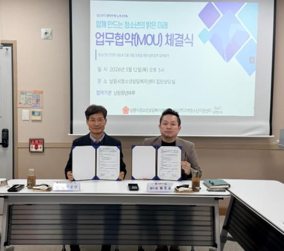 [경남도민뉴스=최인태 기자] 남원시가 위탁하고 남원CYA가 운영하는 남원시학교밖청소년지원센터는 지난 12일 남원청년마루와 학교 밖 청소년의 건강한 성장과 자립 지원을 위한 업무협약(MOU)을 체결했다고 밝혔다.