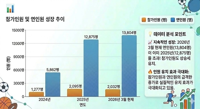 탄탄한 인프라 위에 얹어진 거창군만의 원스톱 패키지 지원 정책은 가시적인 성과로 나타났다. 2025년 한 해 동안 거창을 찾은 전지훈련 인원은 연인원 기준 12,875명으로 지난 3년간 역대 최대 수치를 경신했다. 이러한 상승세는 2026년에 들어 더욱 가팔라졌다. 올해 1월부터 3월 현재까지만 해도 벌써 70개 팀 2,032명이 거창을 방문했으며, 이를 연인원으로 환산하면 13,804명에 달한다. 이는 작년 전체 수치를 이미 넘어선 놀라운 기록이다. 이에 따른 경제적 파급효과는 약 12억 원으로 추산되며 선수단을 따라온 학부모와 관계자들의 소비까지 고려하면 실제 지역 경제에 미치는 영향력은 훨씬 클 것으로 분석된다.