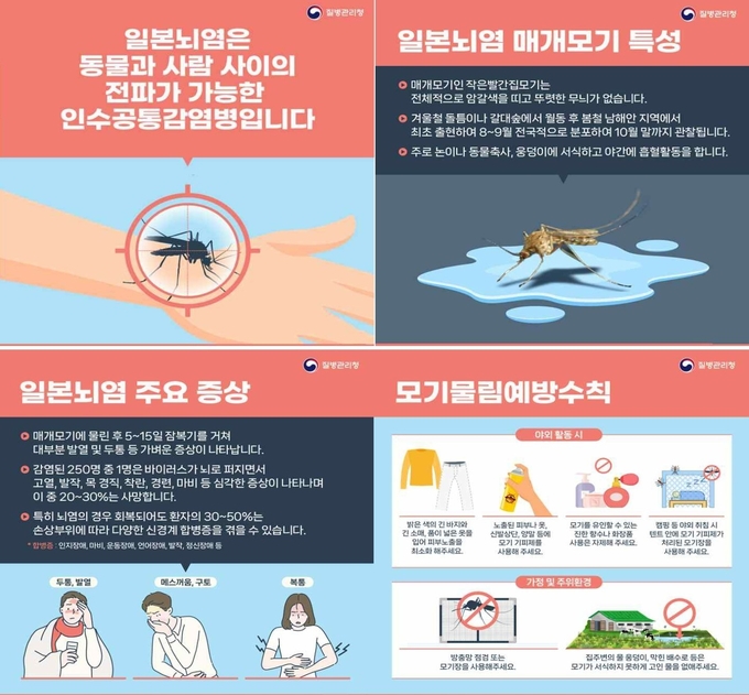일본뇌염은 작은빨간집모기에 의해 주로 전파되는 감염병으로, 감염 시 발열, 두통, 구토 등 가벼운 증상을 보이지만 드물게 뇌염으로 진행되면 고열, 발작, 마비 등의 치명적인 증상이 나타난다.