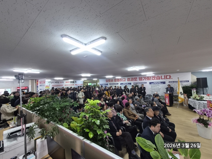 26일 거창읍 중앙리에서 열린 선거사무소 개소식에서 이홍기 거창군수선거 예비후보가 던진 첫 메시지다. 이 예비후보는 “이번 선거는 특정 경쟁자와의 싸움이 아니라 거창의 생존이 달린 미래와의 싸움”이라고 규정하며 “거창의 새로운 30년”을 향한 본격적인 선거 행보에 나섰다.