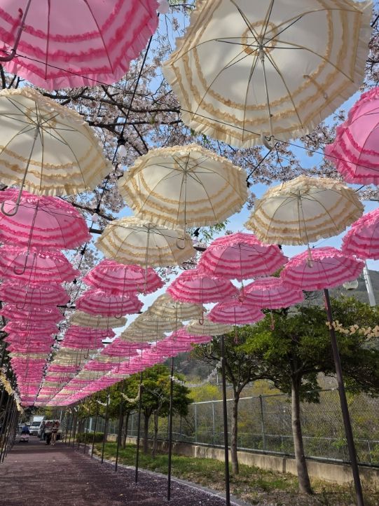 만개한 벚꽃 터널 아래 설치된 양산들은 축제장 특유의 화사한 분위기와 어우러져 시각적인 즐거움을 더했으며, 보행로를 따라 이색적인 분위기를 조성해 축제장을 찾은 시민들의 눈길을 끌었다.