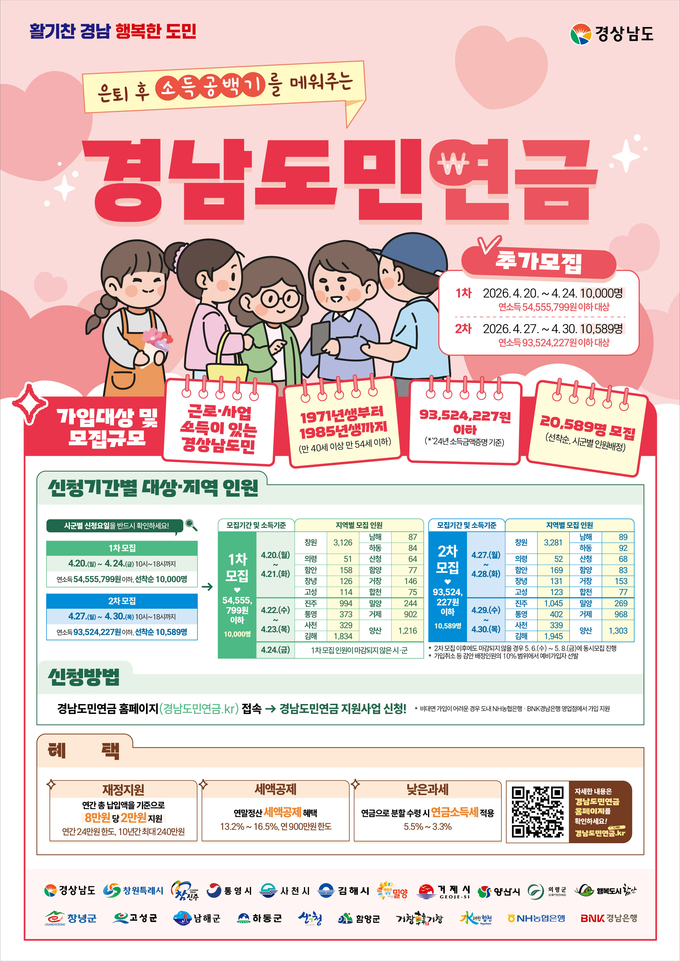 [경남도민뉴스=백형찬 기자] 거창군은 소득 공백기 대비와 안정적인 노후 준비를 지원하기 위해 ‘2026년 경남도민연금 가입자 추가모집’을 오는 4월 20일부터 30일까지 실시한다.