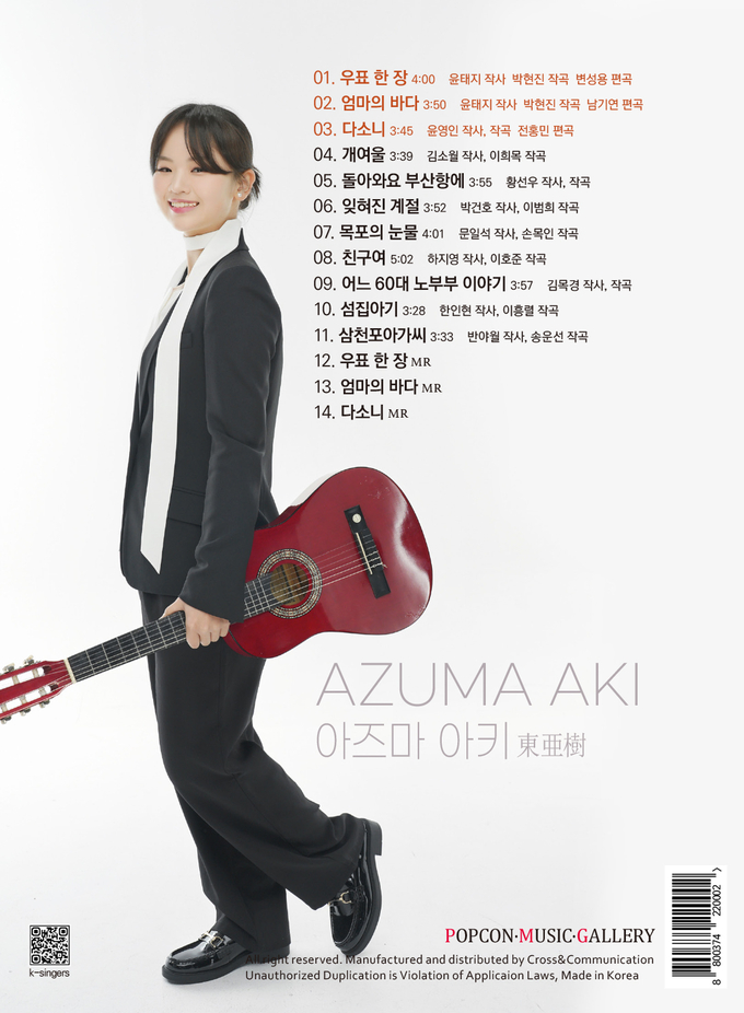 아즈마 아키는 4월 앨범 발표와 동시에 팬들을 위한 화보집을 발간하며, 신곡 음원 서비스 및 방송 활동, 뮤직비디오 공개를 통해 팬들을 찾아갈 예정이다. 또한, 음반 발매를 기념해 서울과 부산을 시작으로 한 전국 콘서트 투어를 개최하며 본격적인 한국 활동을 이어갈 계획이다. 이번 앨범 작업에도 직접 참여한 삼천포아가씨가요제 이미연 대회장은 “우리 가요제 출신이자 홍보대사인 박서진과 더불어 아즈마 아키가 우리 사천이 제2의 고향이 되어 지역 홍보에 앞장설 수 있도록 많이 응원해 달라.” 고 당부했다.