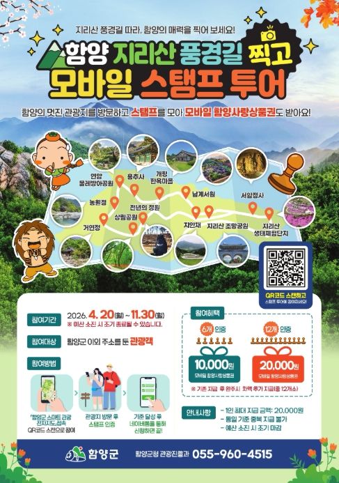 군 관계자는 “이번 모바일 스탬프 투어는 관광객이 함양의 주요 명소를 직접 방문하며 지역의 매력을 자연스럽게 체험할 수 있도록 마련한 참여형 관광 프로그램”이라며 “많은 관광객이 지리산 풍경길과 함양의 아름다운 관광지를 둘러보며 특별한 추억도 만들고, 지역경제에도 활력을 더해 주시길 바란다”라고 말했다.