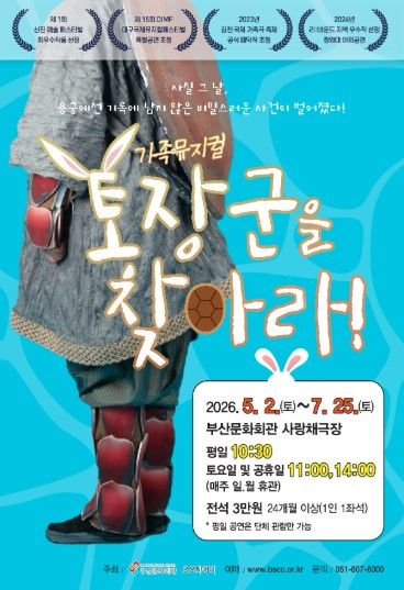 [경남도민뉴스=신석주 기자] (재)부산문화회관은 가족 뮤지컬 '토장군을 찾아라'를 오는 5월 2일부터 7월 25일까지 부산문화회관 사랑채극장에 올린다.