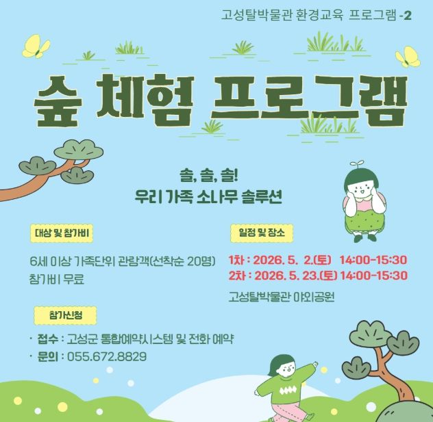 [경남도민뉴스=김태수 기자] 고성탈박물관은 오는 5월 2일과 23일 오후 2시부터 가족 관람객 20명을 대상으로 숲 체험 프로그램을 운영한다.