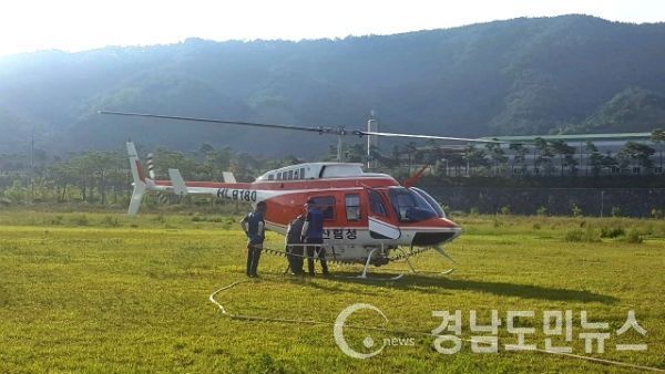 (함양/최병일) = 함양군은 최근 고온 건조한 날씨로 늘어나고 있는 갈색날개매미충 등 돌발해충 피해를 방지하기 위해 14일 과수원 인근 산림지역에 헬기를 이용한 항공방제를 실시했다.