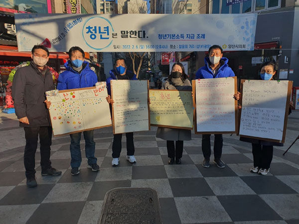 [경남도민뉴스] 박재우 양산시의원은 26일 오후4시 젊음의 거리 샵(#)광장에서 청년기본소득 지급 조례 제정과 관련하여 입법버스킹 청청(靑聽)을 개최하였으며 이날은 표병호 ․ 이상열 도의원을 비롯하여 임정섭, 최선호, 문신우, 박미해, 김혜림 등 동료 시의원이 참석하였다.