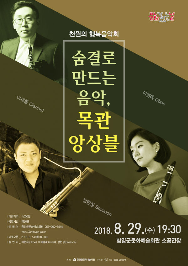 (함양/최병일) = 함양군은 오는 29일 오후 7시 30분 함양군문화예술회관 대공연장에서 이현옥(Oboe), 이새롬(Clarinet), 장현성(Bassoon)의‘숨결로 만드는 음악, 목관 앙상블’공연을 연다고 28일 밝혔다.