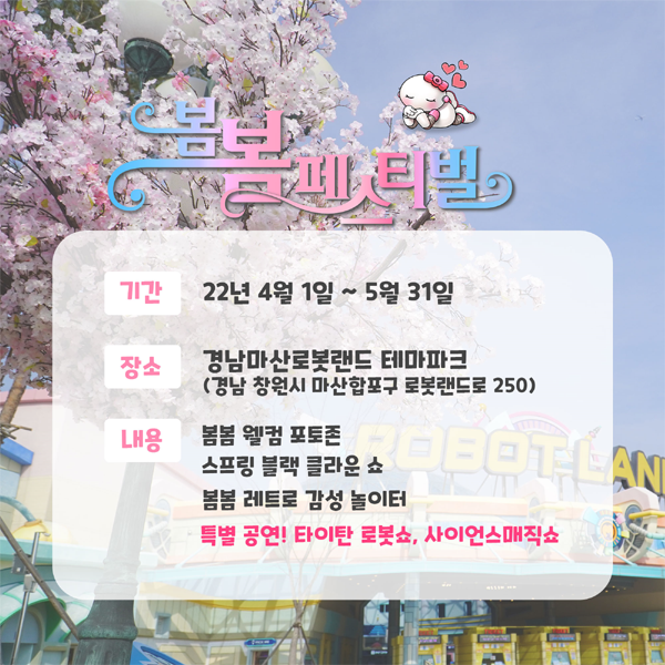 [경남도민뉴스] 로봇랜드재단은 다가오는 봄을 맞이하여 4.1.~5.31. 두 달간 로봇랜드 테마파크에서 “봄봄 페스티벌”을 진행한다고 밝혔다. 이벤트는 벚꽃 포토존, 로봇 콘텐츠 공연, 버스킹, 서커스매직쇼, 체험학습 등 테마파크 곳곳에서 진행된다.