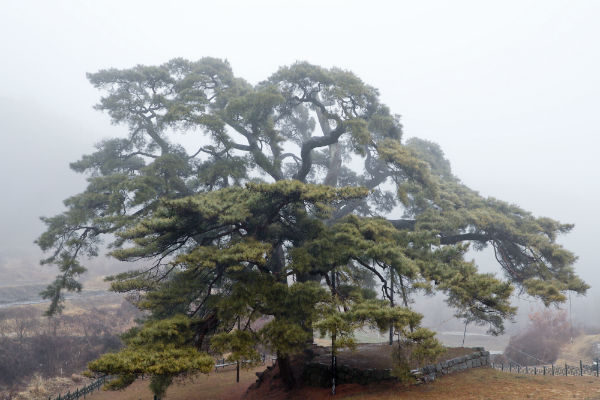 봄을 기다리는 합천군 묘산면 회양리의 소나무는 해발 500m 정도 되는 곳에 위치한 나곡마을의 논 가운데 서 있으며 나이는 500년 정도로 추정된다.