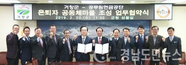 (경남도민뉴스) = 거창군은 20일 오전 군청 회의실에서 공무원연금공단과 ‘은퇴자 공동체마을’ 업무협약(MOU)을 체결했다고 밝혔다.