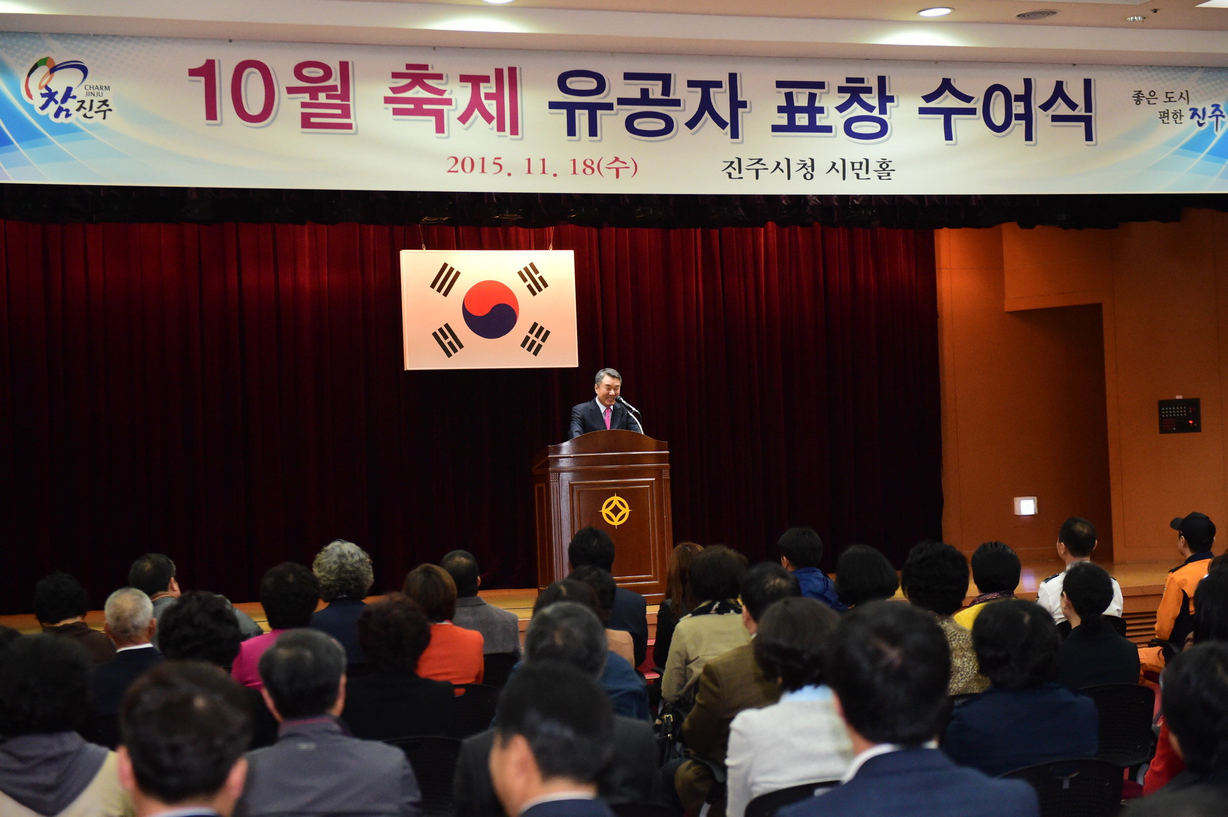 이날 표창 수여식은 지난 10월 1일부터 11일까지 열렸던 진주남강유등축제, 개천예술제, 코리아드라마페스티벌 등 진주의「10월 축제」를 성공적으로 이끈 유관기관, 단체, 시민, 공무원 등 유공자에게 표창을 수여하고 이창희 진주시장이 그간의 노고에 대한 감사와 격려의 의미로 마련됐다.