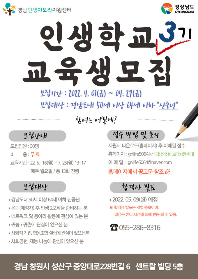 경상남도는 5060 신중년 세대(50~64세)들이 은퇴 이후 성공적인 제2의 인생을 설계할 수 있도록 지원하는 ‘신중년 빛나는 인생학교’ 제3기 교육생을 4월 29일까지 모집한다.