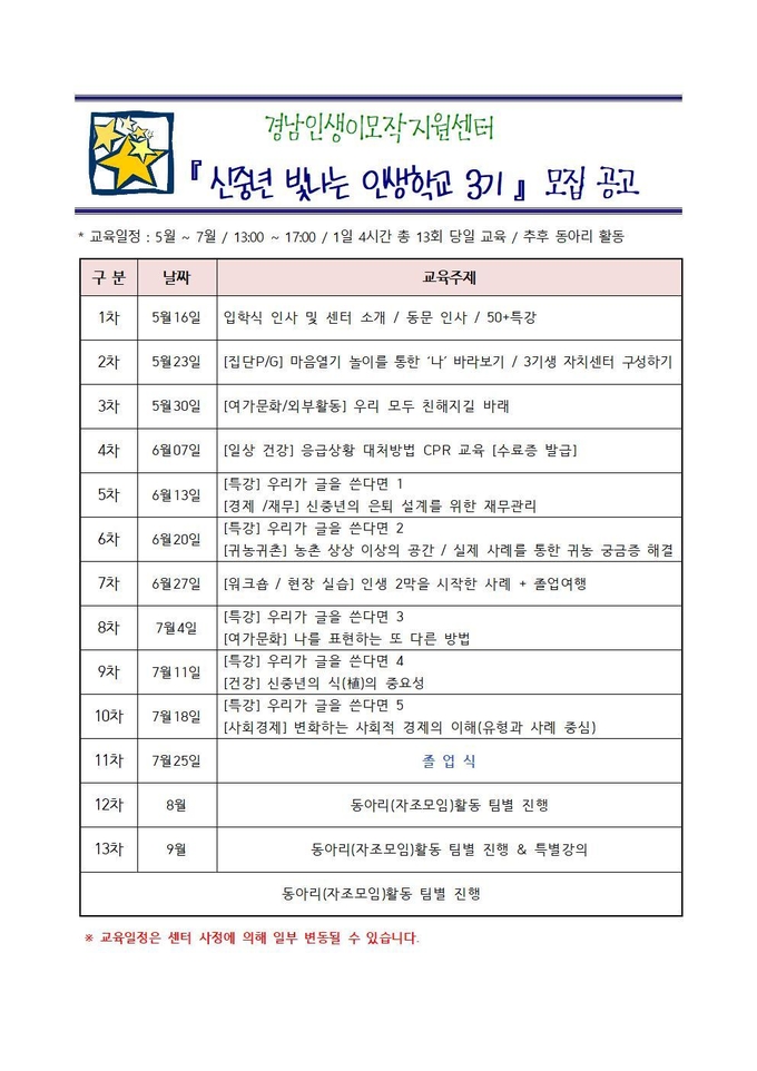 제3기는 5월 개강하여 9월까지 총 13주 과정으로 진행될 예정으로, 5월 초에 최종 선정자를 발표한 후 입학식은 5월 16일 개최할 계획이다. 경남도 신중년 일자리 사업의 총괄기관인 경남인생이모작지원센터를 통해 오는 29일까지 신청서를 접수해 30명을 모집한다.