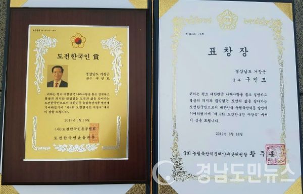 (경남도민뉴스) = 구인모 거창군수는 지난 16일 국회의원회관에서 열린 ‘제8회 도전한국인 시상식’에서 (사)도전한국인운동협회와 도전한국인운동본부에서 ‘도전한국인 상’과 국회 농림축산식품해양수산위원장이 수여하는 ‘표창장‘을 동시에 수상하는 영광을 앉았다.