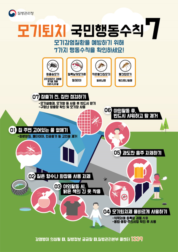 도내에서도 일본뇌염 매개모기가 확인된 만큼 야외 활동 시 밝은색의 긴 바지와 긴 소매의 옷을 입어 피부 노출을 최소화하고, 노출된 피부에는 모기 기피제를 사용하며, 가정에서는 방충망 또는 모기장을 사용하는 등의 주의를 기울여야 한다.