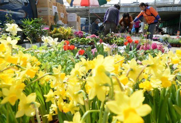 춘분이자 장날인 21일 경남 거창군 거창읍 중앙교 아래 꽃시장에서 주민들이 봄꽃을 고르고 있다.