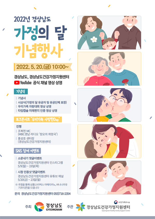 [경남도민뉴스] 경상남도와 경상남도 건강가정지원센터는 5월 가정의 달을 맞이하여 가족의 소중함을 되새기고 건강한 가족문화를 확산하기 위해 오는 5월 23일까지 다양한 온라인 가족참여 프로그램을 운영한다고 밝혔다.