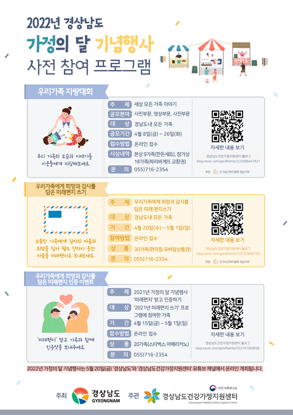 박현숙 경남도 가족지원과장은 “5월 가정의 달을 맞이한 가족 행사에 많이 참여하여 가족과 함께 소중한 추억을 쌓기를 바란다”며 “지역사회에 가족의 가치를 확산하고, 건강하고 행복한 가족문화가 조성될 수 있으면 좋겠다”고 말했다