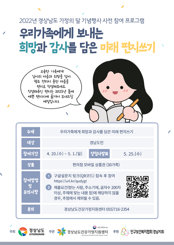 자세한 내용은 경상남도 건강가정지원센터 누리집을 참조하거나 전화(☏055-716-2354)로 문의하면 된다.