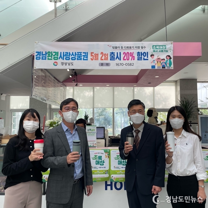 경남환경사랑상품권은 도가 지정한 초록매장에서 소비자가 1회용기 대신 텀블러 등의 다회용기를 가져와서 이용할 경우 사용 가능한 상품권으로, 고객별 월 최대 10만 원까지 20% 선 할인된 금액의 제로페이 모바일상품권으로 구매 가능하다.