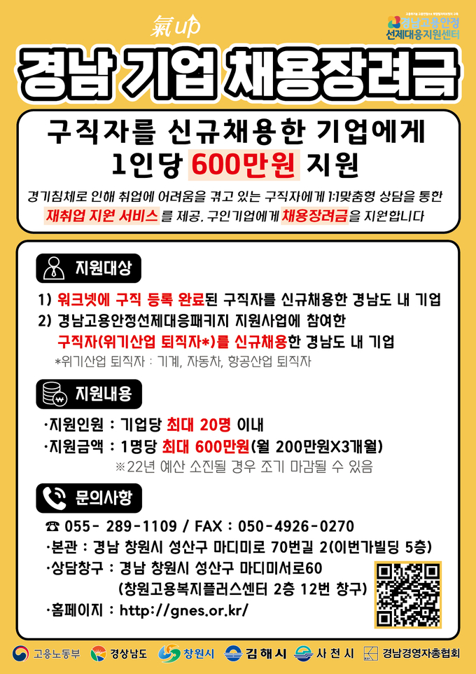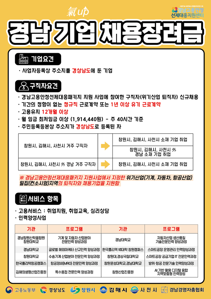 [경남도민뉴스] 경상남도는 고용노동부와 함께하는 ‘고용안정 선제대응 패키지 지원사업’의 일환으로 위기산업 퇴직노동자의 재취업을 적극 지원하기 위해 ‘경남 기업(氣up) 채용장려금 지원’ 사업을 실시한다고 밝혔다.
