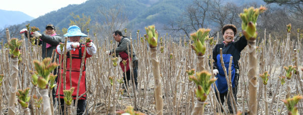 11일 경남 거창군 신원면 신기마을 농민들이 봄철 대표 먹거리인 참두릅나무에서 새순을 따고 있다.