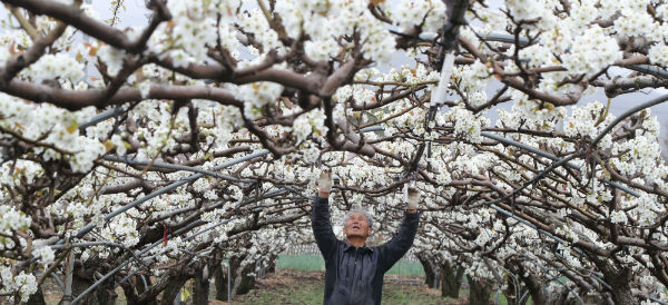 11일 경남 함양군 병곡면 도천마을 배나무 과수농가에서 한 농민이 꽃망울을 터뜨린 하얀 배꽃을 돌보며 손질하고 있다.