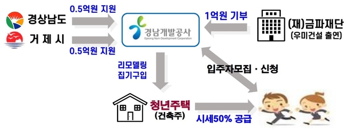 이번 협약으로 경남도와 거제시는 거제지역 ‘거북이집’ 조성을 위해 사업비 각 5천만 원을 투입하고, 사업계획 수립과 대상지 발굴 등을 추진한다. (재)금파재단은 도내 청년의 주거안정을 위해 사업비 1억 원을 기부하고, 경남개발공사는 새단장(리모델링)에 필요한 설계용역 및 공사 추진, 최초 입주자 모집 등 사업 시행을 담당한다.