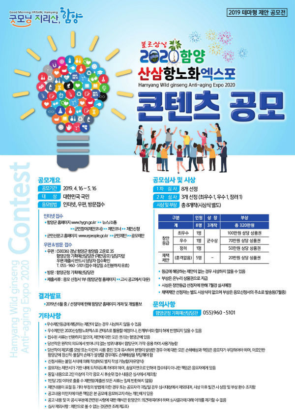 (경남도민뉴스) = 함양군이 불로장생 2020함양산삼항노화엑스포 성공적인 개최를 위해 창의적이고 발전적인 아이디어를 공모한다.