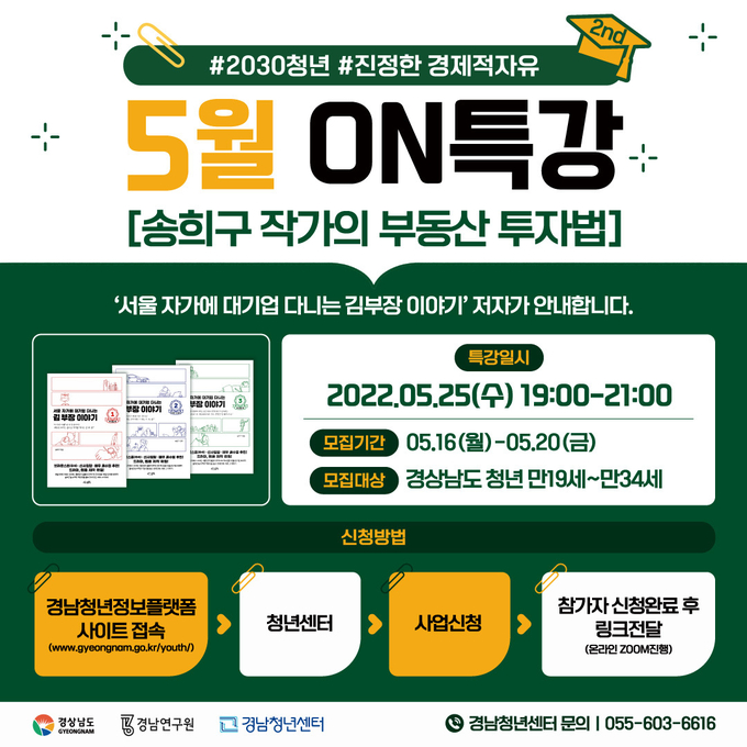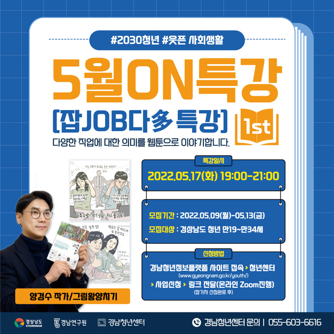 박정의 경남청년센터 센터장 직무대리는 “그림왕 양치기라는 예명을 가진 양경수 작가와 평범한 직장인으로 독서와 투자를 시작한 송희구 작가는 요즘 청년들이 관심을 가지는 분야의 트렌드세터로 지역에서 모시기 힘든 분들”이라며 “경남 소재의 많은 청년들과 직장인들에게 뜻깊은 이야기를 제공해 서로 소통하고 자신을 알아갈 수 있는 시간이 되길 바란다”고 말했다.