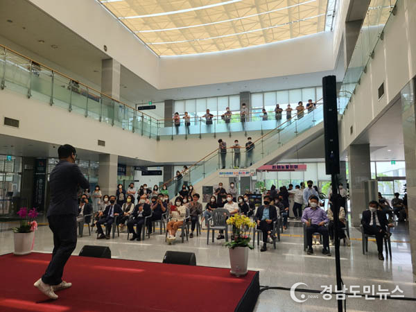 [경남도민뉴스] 경남도는 5월 19일(목) 서부청사 1층 로비에서 서부청사 내방객, 직원 등 100여 명이 관람하는 가운데 서민경 보컬리스트와 안형수 전자바이올리니스트를 초청, 작은 음악회를 개최했다.