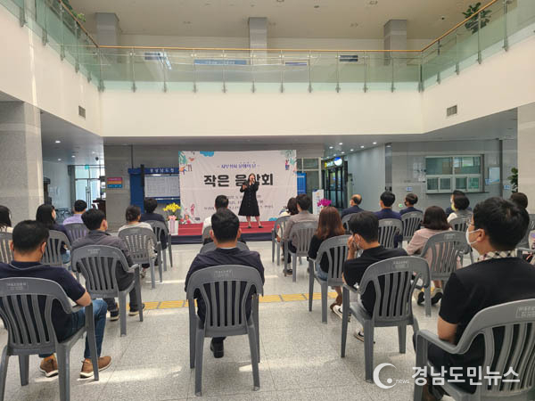 이번 작은 음악회에는 도내 지역 예술인으로 개천예술제 실용 음악콩쿨에서 금상 수상, 홍대 에반스홀 공연 등 다양한 활동을 하며 현재 경남예술고등학교에 출강 중인 보컬리스트 서민경의 노래와 부산국제영화제 오프닝연주, 창원시 찾아가는 작은음악회 등 다수 연주경험이 있는 전자바이올리니스트 안형수의 전자바이올린 연주가 있었다.