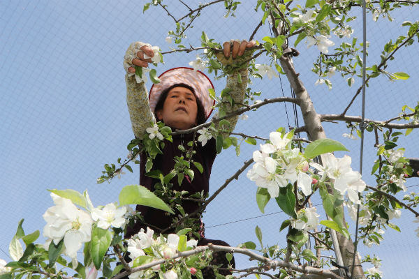 30일 경남 함양군 서하면 은행마을 김정민씨 사과 과수원에서 농민들이 풍년을 기원하며 사과나무 적화(꽃 따기)를 하고 있다.