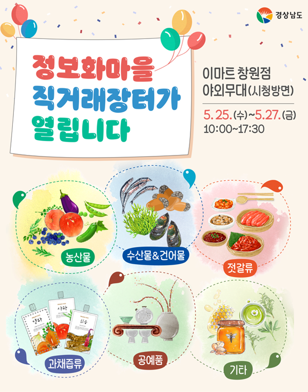 [경남도민뉴스] 경상남도는 오는 25일부터 27일까지 3일간, 이마트 창원점 야외무대에서 정보화마을 직거래장터를 개최한다.