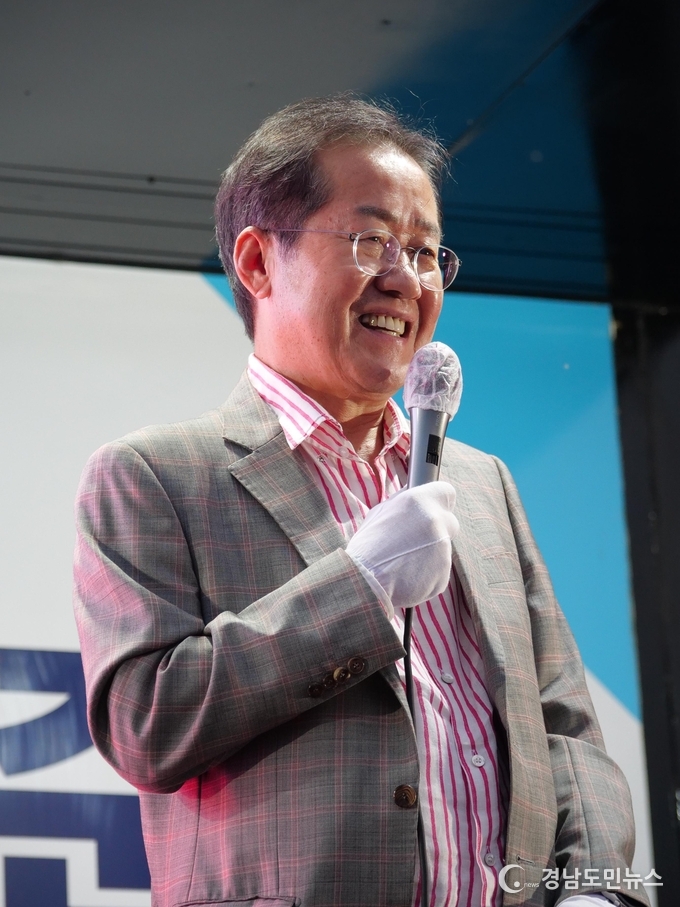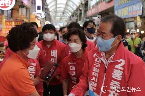 [경남도민뉴스] 홍준표 국민의힘 대구시장 후보는 23일(월) 관문시장과 남구 일원을 순회한 다음 저녁에는 중동교 인근 신천종합생활체육광장에서 정치버스킹, ‘만민공동회’를 이어갔다.