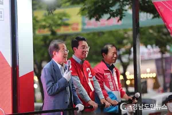[경남도민뉴스] 홍준표 국민의힘 대구시장 후보는 24일(화) 서구 원고개시장 유세로 시작해서 그린웨이 암석원에서 제4차 구군 순회 정치버스킹 ‘만민공동회’를 개최했다.